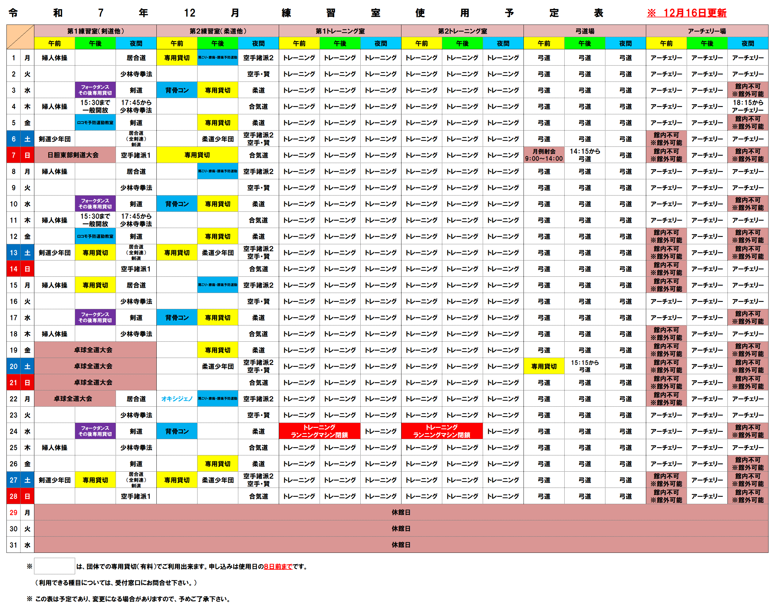 トレーニング室のみ毎月最終水曜日(メンテナンスのため)